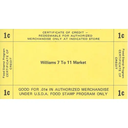 | Obverse lettering | 1c 1c CERTIFICATE OF CREDIT - REDEEMABLE FOR AUTHORIZED MERCHANDISE ONLY AT INDICATED STORE Food Stamp Program CERTIFICATE OF CREDIT Food Stamp Program CERTIFICATE OF CREDIT Williams 7 To 11 Market GOOD FOR .01₵ IN AUTHORIZED MERCHANDISE UNDER U.S.D.A. FOOD STAMP PROGRAM ONLY 1c 1c |