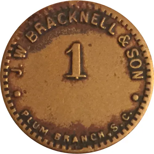 | Obverse lettering | J.W. BRACKNELL & SON 1 PLUM BRANCH, S.C. |