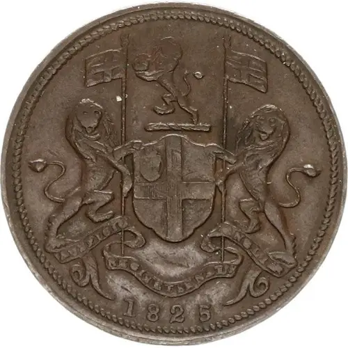 | Description de l’avers | British East India Company coat of arms with supporters. Lion rampant holding a crown between its fore paws above shield. Date Below. Beads around border. |