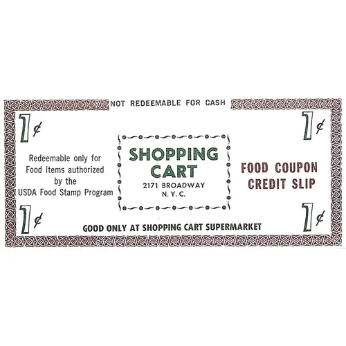 | Obverse lettering | NOT REDEEMABLE FOR CASH 1₵ 1₵ SHOPPING CART 2171 BROADWAY N.Y.C. Redeemable only for Food Items authorized By the USDA Food Stamp Program FOOD COUPON CREDIT SLIP 1₵ GOOD ONLY AT SHOPPING CART SUPERMARKET 1₵ |