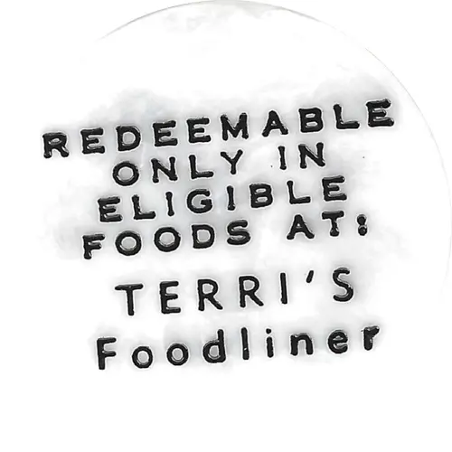 | Obverse lettering | REDEEMABLE ONLY IN ELIGIBLE FOODS AT: TERRI’S Foodliner |