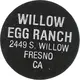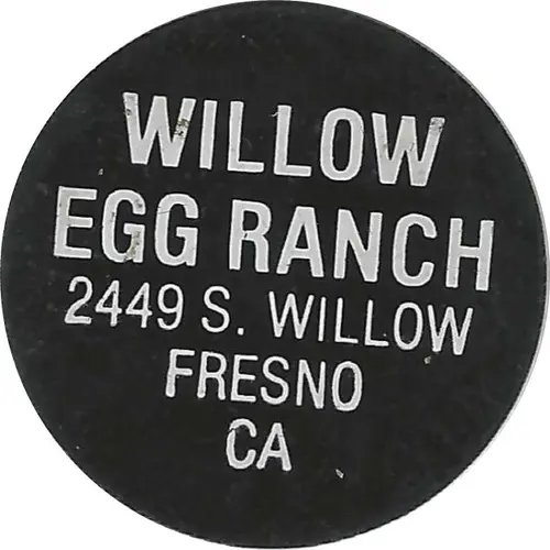 | Obverse lettering | WILLOW EGG RANCH 2449 S.WILLOW FREESNO CA |