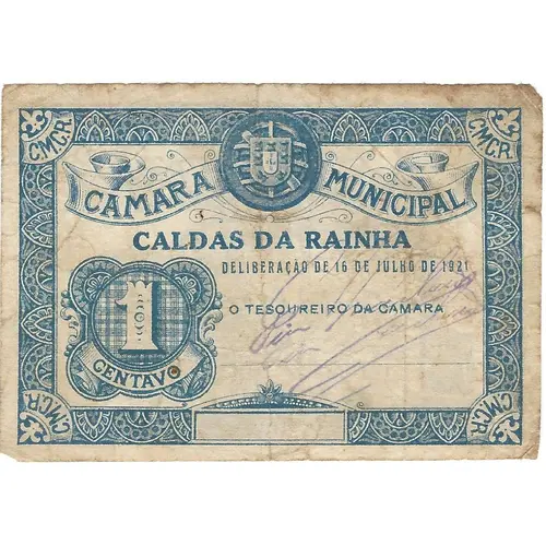 | Obverse lettering | CAMARA MUNICIPAL CALDAS DA RAINHA DELIBERAÇÃO DE 16 DE JULHO DE 1921 1 CENTAVO (Translation: City Council of Caldas da Rainha Deliberation of July 16, 1921 1 Cent) |