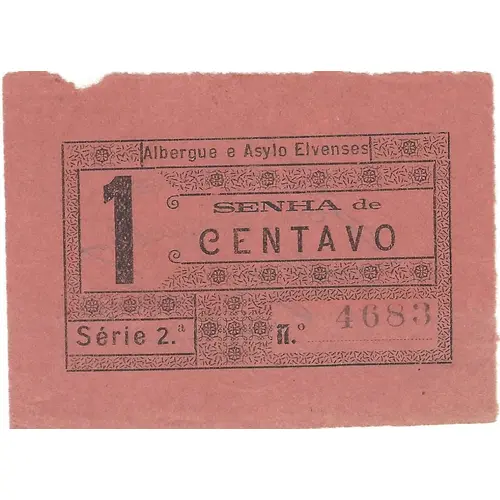 Albergue e Asilo Elvenses SENHA de 1 CENTAVO Serie 2a. (Translation: Elvenses Hostel and Asylum 1 Cent password Series 2a.) |