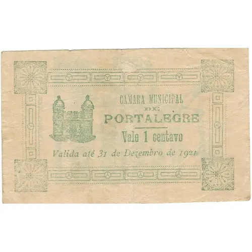 CAMARA MUNICIPAL DE PORTALEGRE Vale 1 Centavo Válida até 31 de Dezembro de 1921 (Translation: Portalegre City Council Worth 1 cent Valid until December 31, 1921) |