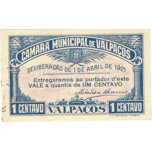 | Obverse lettering | CAMARA MUNICIPAL DE VALPAÇOS DELIBERAÇÃO DE 1 DE ABRIL DE 1921 Entregaremos ao portador d`este VALE a quantia de 1 CENTAVO VALPAÇOS (Translation: Valpaços City Council Deliberation of April 1, 1921 We will deliver to the bearer of this worth the amount of 1 Cent) |
