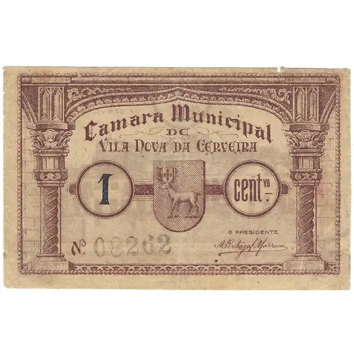 Camara Municipal de Vila Nova da Cerveira 1 Centavo (Translation: Vila Nova de Cerveira City Council 1 cent) |