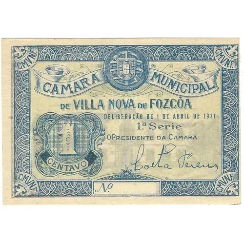 | Obverse lettering | CAMARA MUNICIPAL DE VILA NOVA DE FOZ CÔA DELIBERAÇÃO DE 1 DE ABRIL DE 1921 1a Série 1 CENTAVO (Translation: City Council of Vila Nova de Foz Côa Deliberation of April 1st., 1921 1st. Series 1 Cent) |