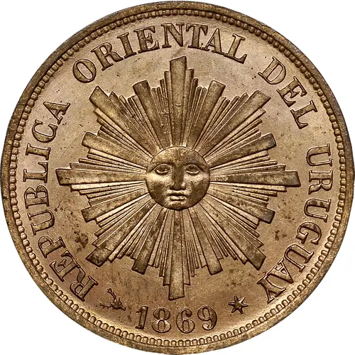 Historical Context: Uruguay in 1869 was consolidating its national identity and monetary system under President Lorenzo Batlle y Grau. This era was marked by internal political challenges, including the "Revolución de las Lanzas." The 1 Centésimo represents a crucial step in establishing a stable national currency based on the decimal system, formally adopted in 1862. It underscored the republic's sovereignty and economic modernization efforts, moving away from earlier provisional issues, though the coins were typically minted abroad, often in England, reflecting international economic ties.