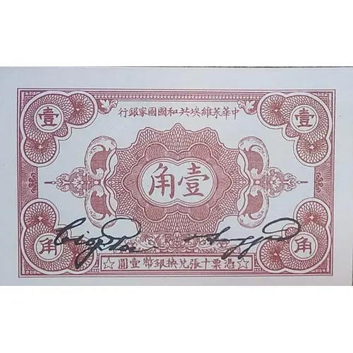 | Ön yüz lejandı | 中華蘇維埃共和國國家銀行西北分行 壹角 凭票十张兑换银币一元 (Translation: CHINESE SOVIET REPUBLIC NATIONAL BANK - NORTHWEST BRANCH One Jiao Use 10 of this note to exchange silver coin 1 dollar) |