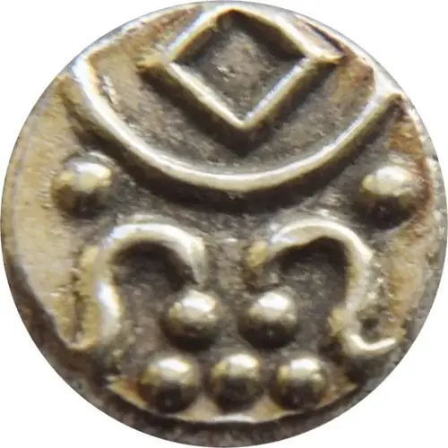 | Obverse description | Crescent with diamond above and two curved lines and ten pellets below (some off flan) . The curved lines and pellets are a depiction of `Vishnupaadam` (feet of Lord Vishnu, a God in Hinduism). |