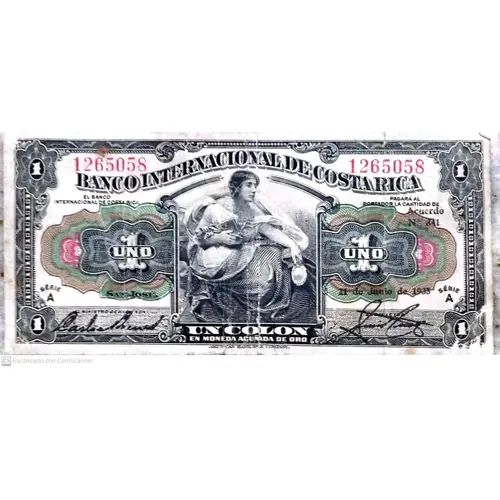 BANCO INTERNACIONAL DE COSTA RICA EL BANCO INTERNACIONAL DE COSTA RICA PAGARÁ AL PORTADOR LA CANTIDAD DE UNO 1 SÉRIE A SAN JOSÉ, 21 de junio de 1935 SÉRIE A UN COLON EN MONEDA ACUÑADA DE ORO AMERICAN BANK NOTE COMPANY. |