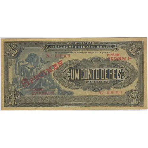 | Reverse lettering | ESTADOS UNIDOS DO BRASIL 1 CONTO DE RÉIS SPECIMEN UM CONTO DE RÉIS (Translation: United States of Brazil One Thousand Thousand Reis SPECIMEN) |