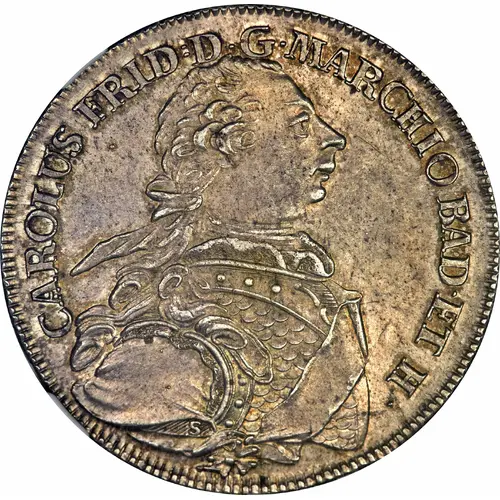 Artistry: The coin's design showcases the mid-18th century transitional style, bridging late Baroque grandeur with nascent Neoclassical simplicity. While the engraver is typically anonymous, the obverse features a dignified, often idealized bust of Charles Frederick, typical of contemporary royal portraiture. The reverse meticulously displays the elaborate ducal arms of Baden-Durlach, surmounted by a crown. This heraldic precision underscores the Margrave's sovereign authority and dynastic lineage, embodying aesthetic and political conventions.