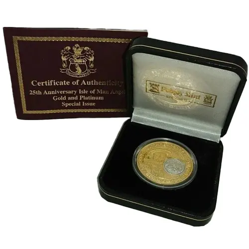 | Composition | Bimetallic: platinum (.999) center in gold (.9999) ring (with inlaid 1/20 oz Platinum) |