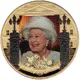 A photograph of a smiling Queen taken during Her Majesty’s Diamond Jubilee year in 2012. The gates of Buckingham Palace border the image and at the bottom, a bouquet of flowers is depicted together with a ribbon with the inscription that reads ‘DEVOTED TO YOUR SERVICE’. |