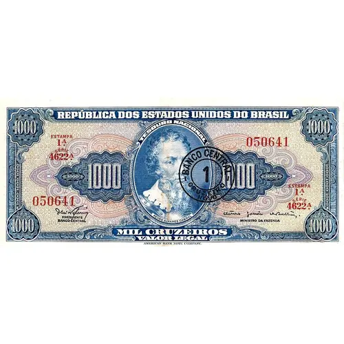 | Obverse description | Blue on polychrome, in chalcography and offset. In the center, oval medallion with the figure of Pedro Alvares Cabral (1467/68-1520), discoverer of Brazil. Above couplet `REPÚBLICA DOS ESTADOS UNIDOS DO BRASIL` (Republic of the United States of Brazil). Below the inscription `MIL CRUZEIROS / VALOR LEGAL` (One Thousand Cruzeiros / Legal Amount). On the left, print number, serial number (above), the sequence number (center) and signature of Director of the Amortization Fund (below). On the right, the sequence number (above), print number, serial number (center) and signature of Finance Minister (below). Round stamp with `BANCO CENTRAL - 1 CRUZEIRO NOVO`. |
