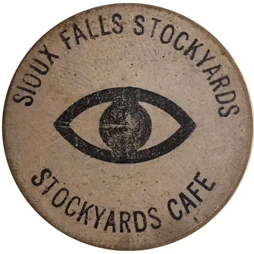 | Obverse description | ‘SIOUX FALLS STOCKYARDS’ on top, an eye in center, and ‘STOCKYARDS CAFE’ on bottom |