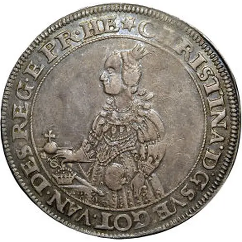 CHRISTINA · D · G · SVE · GOT · VAN ·DES · REG · E · PR · HE · (Translation: Christina Dei Gratia Sveciae Gothorum Vandalorumque Designata Regina Princeps Hereditarius Christina, with God`s grace, designated Queen and hereditary princess of Sweden, the Goths, and the Wends) |