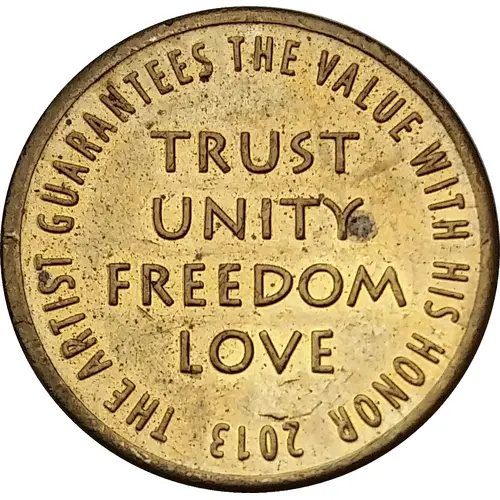 | Obverse lettering | THE ARTIST GUARANTEES THE VALUE WITH HIS HONOR 2013 TRUST UNITY FREEDOM LOVE |