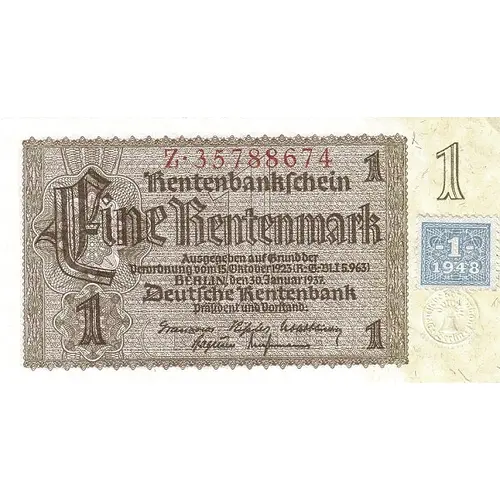 Obverse lettering Rentenbankschein 1  1 Eine Rentenmark  - 1 -          1948 Ausgegeben auf Grund der Verordnung vom 15.October 1923 BERLIN, den 30. Januar 1937. Deutsche Rentenbank Präsident und Vorstand: 1 1