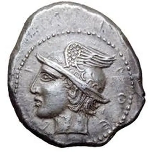 | Obverse description | Turms wearing winged petasos face left and surrounded by legend. |