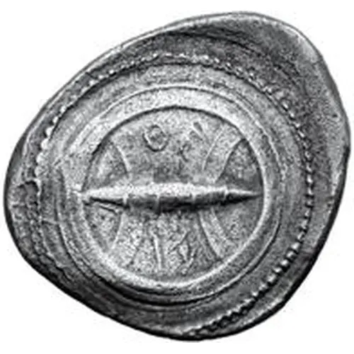 | Beschrijving voorzijde | Archaic wheel supported by crossbars and separating the legend. |