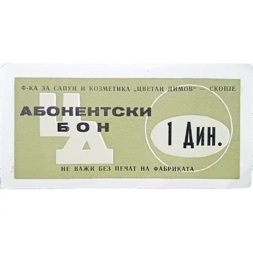 | نوشتههای روی اسکناس | Ф-КA 3A CAПYH И КO3METИКA `ЦBETAH ДИMOB` - CКOПJE AБOHEHTCКИ БOH 1 ДИН. ЦД HE BAЖИ БE3 ПEЧAT HA ФAБPИКATA |