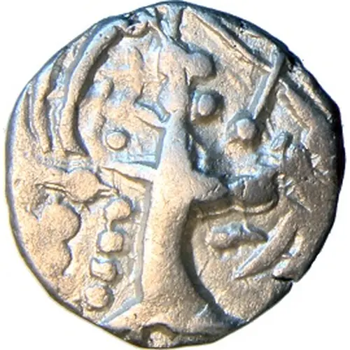 | Obverse description | Highly stylized King standing sacrificing at altar at left. Brahmi legend under arm |