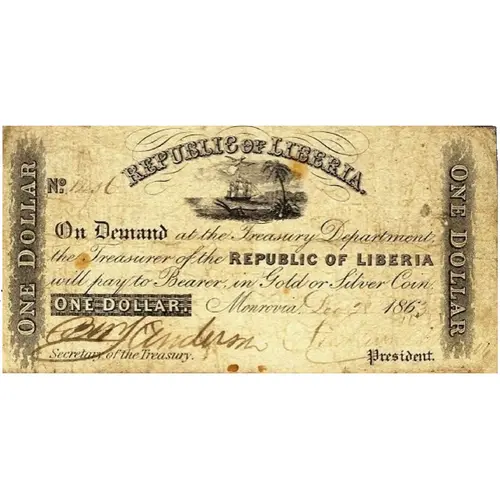 REPUBLIC OF LIBERIA ON DEMAND AT THE TREASURY DEPARTMENT THE TREASURER OF THE REPUBLIC OF LIBERIA WILL PAY TO BEARER IN GOLD OR SILVER COIN ONE DOLLAR |