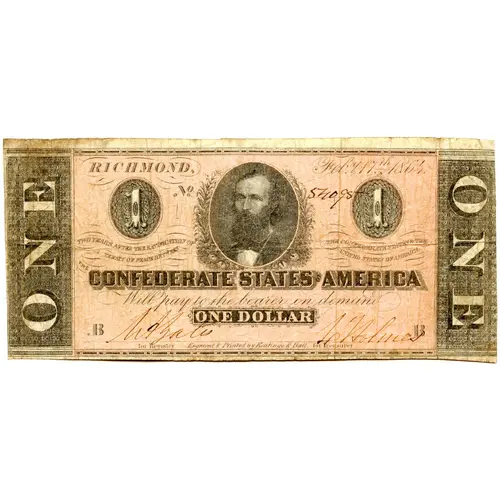 | Obverse lettering | RICHMOND, Febr 17th, 1864. Two years after the ratification of a Treaty of Peace between the Confederate States & The United States of America. THE CONFEDERATE STATES OF AMERICA Will pay to the bearer on demand ONE DOLLAR |