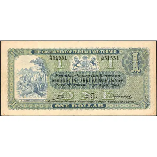 1 THE GOVERNMENT OF TRINIDAD AND TOBAGO 1 A/24 51551 A/24 51551 1 1 1 HONI SOIT QUI MAL Y PENSE DIEU ET MON DROIT Promises to pay the Bearer on demand the sum of One dollar Port-of-Spain, 1st April, 1905. ONE DOLLAR ONE ★ THE LANDING OF COLUMBUS ★ Commissioner of Currency. Commissioner of Currency. Commissioner of Currency. 1 ONE DOLLAR 1 |
