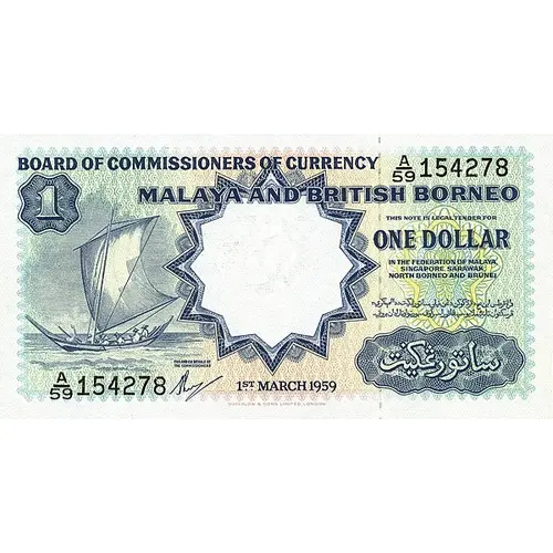 | Obverse lettering | Board of Commissioners of Currency Malaya and British Borneo This note is legal tender for One Dollar in the Federation of Malaya, Singapore, Sarawak, North Borneo and Brunei |