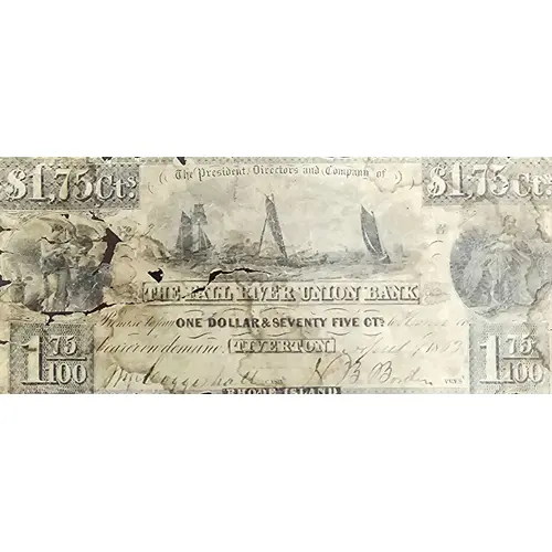 | Obverse lettering | $1,75cts. The President Directors and Company of THE FALL RIVER UNION BANK Promise to pay ONE DOLLAR & SEVENTY FIVE CTs to... or bearer on demand TIVERTON 1853 RHODE ISLAND |
