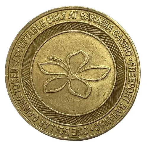 | Ön yüz lejandı | • ACCEPTABLE ONLY AT BAHAMIA CASINO • FREEPORT BAHAMAS • ONE DOLLAR GAMING TOKEN |