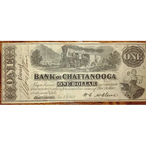 | Obverse lettering | BANK OF CHATTANOOGA Pay to bearer ONE DOLLAR in Confederate Treasury notes, when presented in sums of Five Dollars or its multiple. Jan 4th, 1863. |