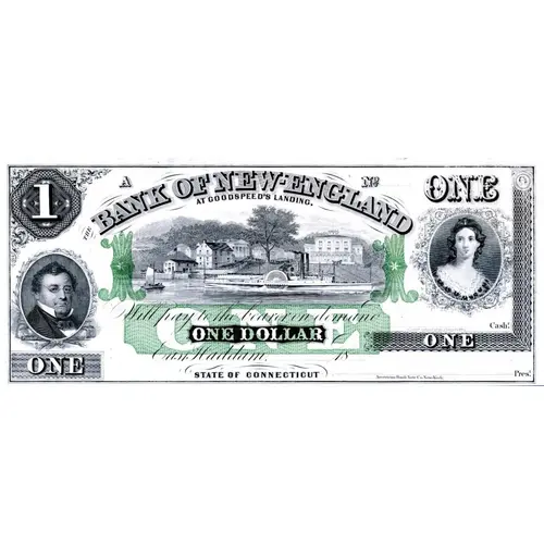 | Obverse lettering | 1 ONE 1 1 BANK OF NEW-ENGLAND AT GODDSPEED`S LANDING Will pay to the bearer on demand ONE DOLLAR ONE East Haddam ____________18___ ONE STATE OF CONNECTICUT_____________________________Pres.ᵗ American Bank Note Co. New-York |