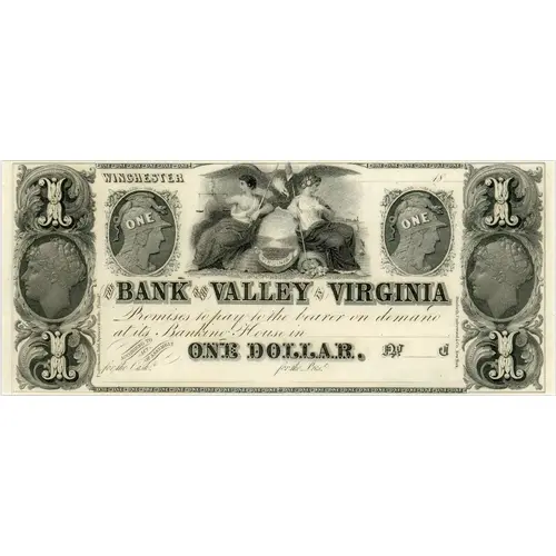 | Obverse lettering | ONE WINCHESTER ONE VIRGINIA ONE THE BANK OF THE VALLEY IN VIRGINIA Promises to pay to the bearer on demand at its Banking House in____ ONE DOLLAR. ACCORDING TO ACT OF ASSEMBLY |