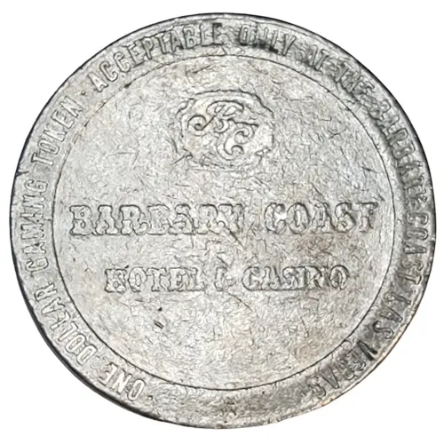 | Obverse lettering | ONE DOLLAR GAMING TOKEN ACCEPTED ONLY AT THE BARBARY COAST LAS VEGAS BC BARBARY COAST HOTEL & CASINO FM |