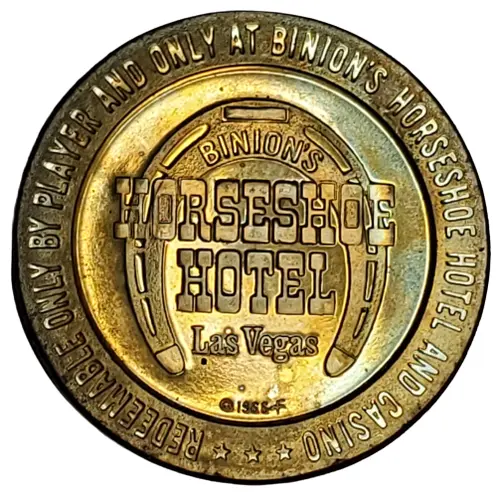 | Reverse lettering | DOLLAR GAMING TOKEN BINION`S HORSESHOE CASINO H GAMBLING TO BE USED ONLY AT BINION`S HORSESHOE HOTEL AND CASINO |