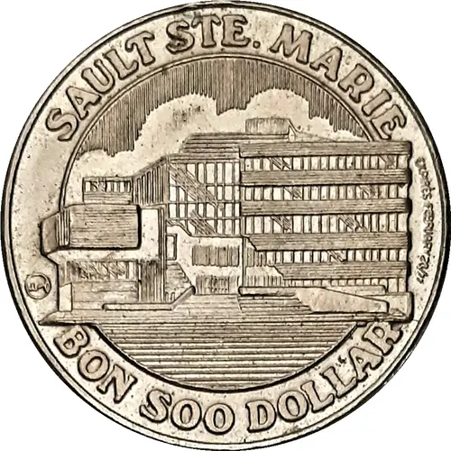 | Obverse lettering | SAULT STE. MARIE EXPIRES FEBRUARY 28, 1977 BON SOO DOLLAR |