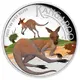 | Reverse description | Kangaroo lying on its side on a hill near rocks. In the background a bounding kangaroo and a grass tree. |