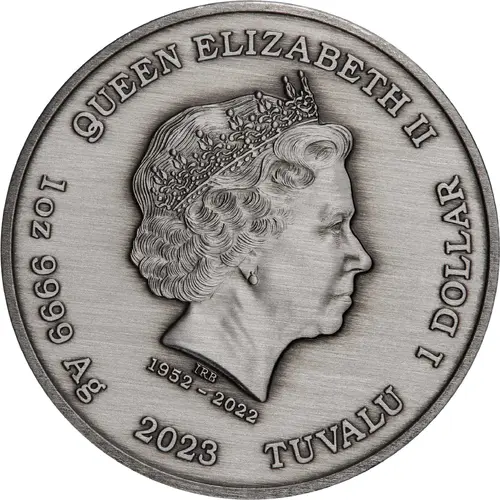 | Obverse lettering | QUEEN ELIZABETH II IRB 1952 - 2022 1oz 9999 Ag 2023 TUVALU 1 DOLLAR |