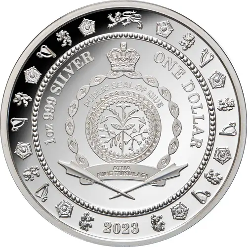 | Obverse lettering | 1 oz 999 SILVER ONE DOLLAR PUBLIC SEAL OF NIUE ATUA NIUE TUKULAGI 2023 |