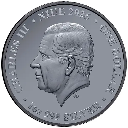 | Opschrift voorzijde | CHARLES III · NIUE 2026 · ONE DOLLAR JC · 1oz 999 SILVER · |