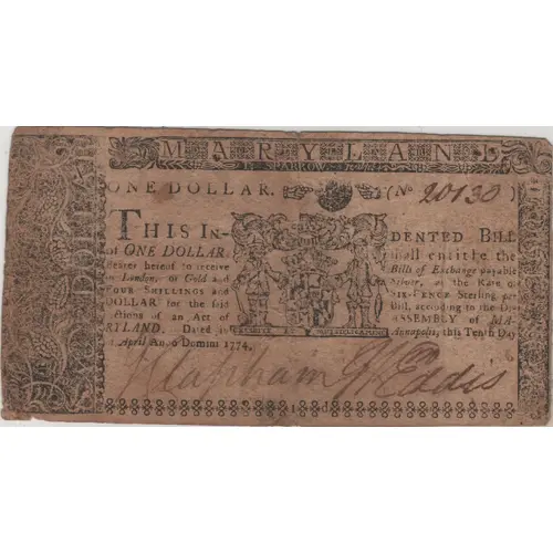 | Obverse lettering | M A R Y L A N D T. Sparrow ONE DOLLAR. THIS IN- DENTED BILL of ONE DOLLAR shall entitle the Bearer hereof to receive Bills of Exchange payable in London, or Gold and silver, at the rate of Four SHILLINGS and SIX-PENCE Sterling per DOLLAR for the said Bill, according to the Di- rections of an Act of ASSEMBLY of MA- RYLAND. Dated is Annapolis, this Tenth Day of April Anno Domini 1774. |