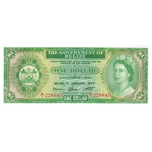 THE GOVERNMENT OF BELIZE THESE NOTES AR LEGAL TENDER FOR THE PAYMENT OF ANY AMOUNT ONE DOLLAR For the GOVERNMENT of BELIZE BELIZE, 1st JANUARY, 1976. COMMISSIONERS OF CURRENCY $1 SUB • UMBRA • FLOREO (Translation: I flourish in the shade.) |