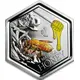 Colored resin is used to depict the rich, golden colour of m nuka honey, and can be seen dripping from a wooden dipper. A digitally printed honey bee is perched on a whitish-pink m nuka flower. |