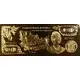 Jaguar (Panthera onca) in front of palm tree on left. Blue heron (Ardea herodias) walking right at centre. Left-facing head of Queen Elizabeth II wearing the State Diadem Tiara at upper right. Carved jade head of god Kinich Ahau at right. |