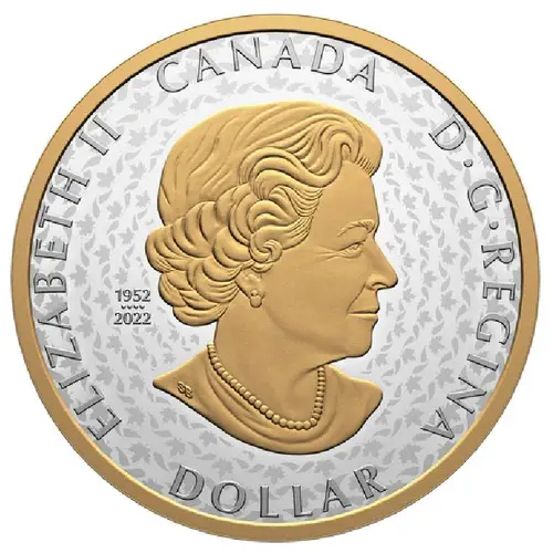 | Opis awersu | Head of Queen Elizabeth II, as at 77 years of age, bare headed, wearing necklace and earrings, facing right. Effigy is accompanied by special marking consisting of double dates `1952` and `2022,` separated by four pearls symbolizing the four effigies that have graced Canadian coins during the reign of Elizabeth II. Background consists of repeating pattern of maple leaves and ribbon. |